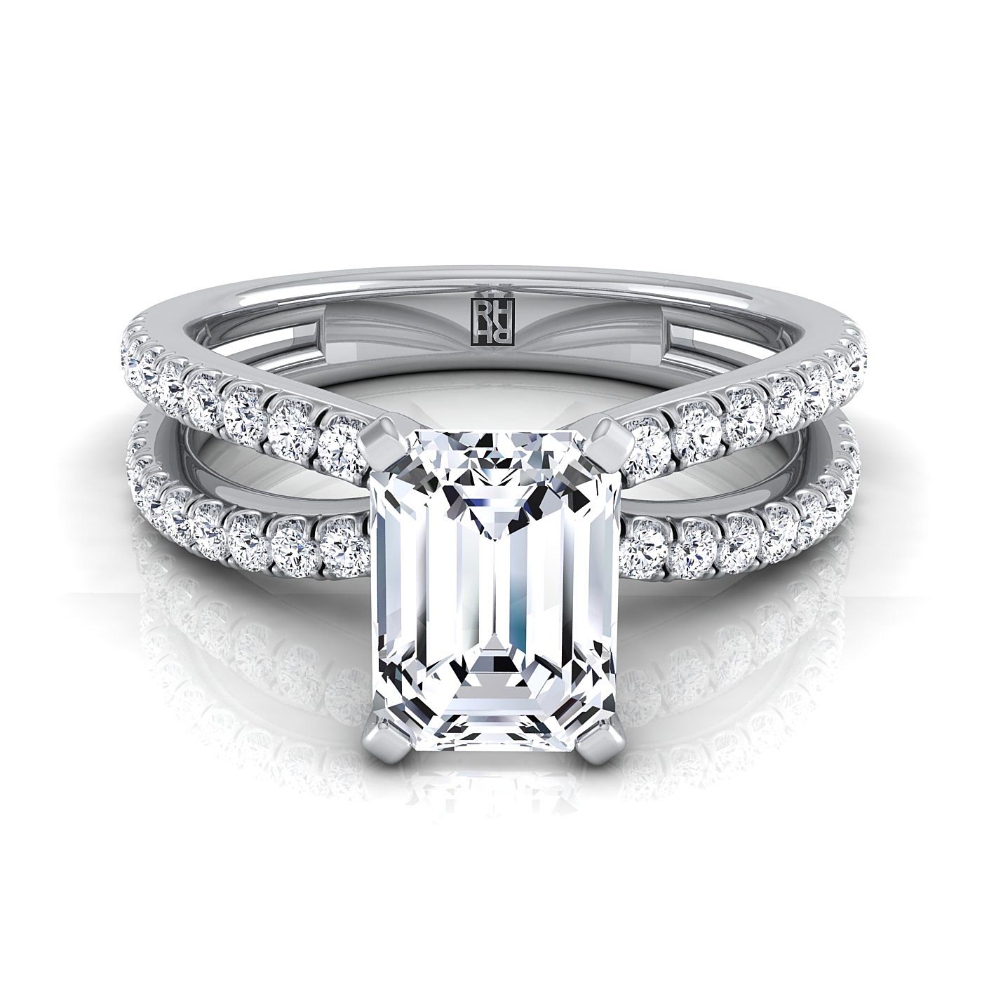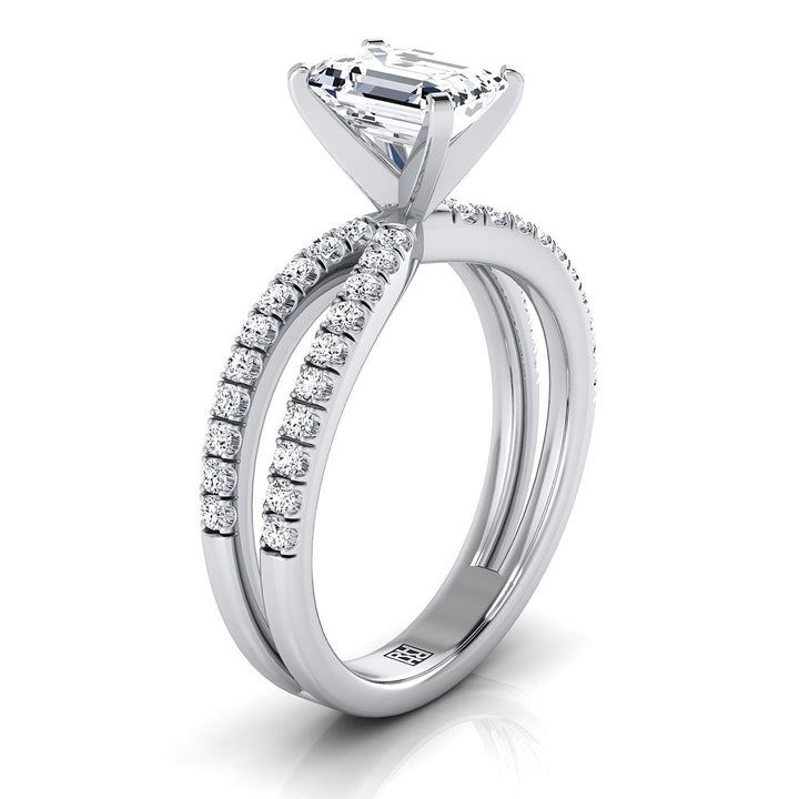 Platinum Emerald Cut Diamond Two Row Pavé Split Shank Engagement Ring -1/3ctw