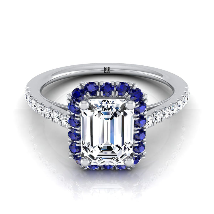 Exquisitely Handcrafted, This Emerald Cut Diamond Engagement Ring Showcases Brilliant Cut Diamonds (h-i/vs 0.20ctw) And Round Sapphires Beautifully Set In A Classic 18k White Gold Setting.