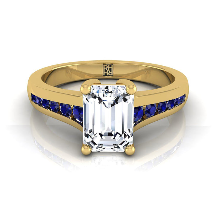 18K Yellow Gold Emerald Cut Contemporary Tapered Blue Sapphire Channel Engagement Ring