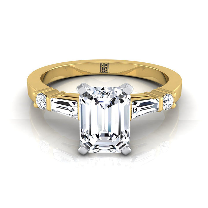 Classic Diamond Engagement Ring Showcasing An Emerald Cut Center Highlighted By Tapered Baguettes And Brilliant Cut Diamonds (h-i/vs 0.25 Ctw) Beautifully Channel And Prong Set In 18k Yellow Gold