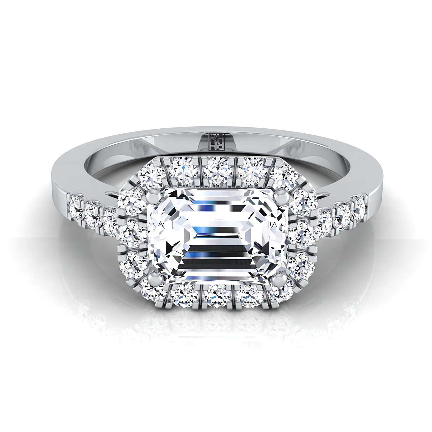 Classic And Elegant, This Emerald Cut Diamond Halo (east -west) Engagement Ring With A Pave Shank Showcases Brilliant Cut Diamonds (h-i/vs 0.30ctw) Beautifully Set In A Classic 14k White Gold Setting.