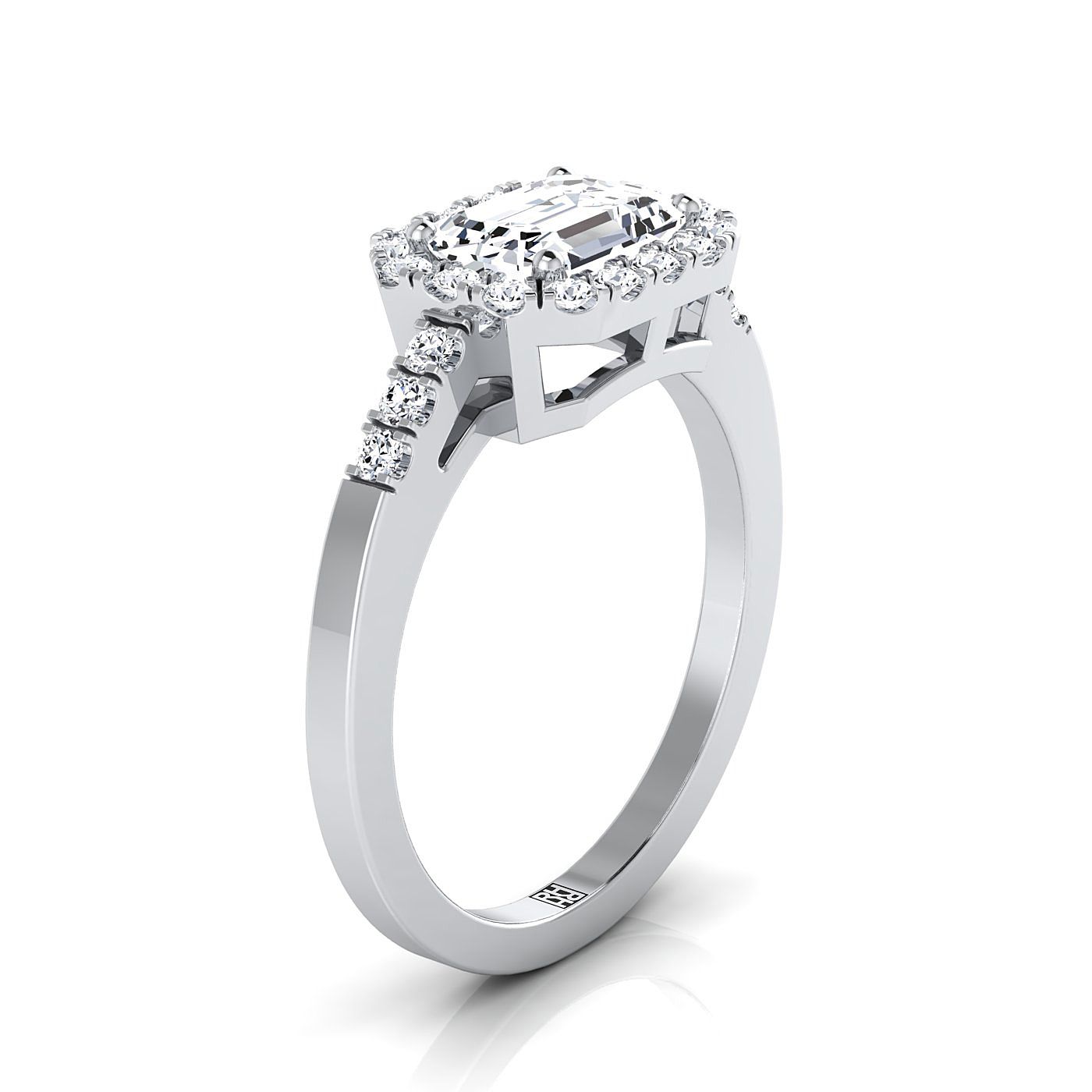 Classic And Elegant, This Emerald Cut Diamond Halo (east -west) Engagement Ring With A Pave Shank Showcases Brilliant Cut Diamonds (h-i/vs 0.30ctw) Beautifully Set In A Classic Platinum Setting.