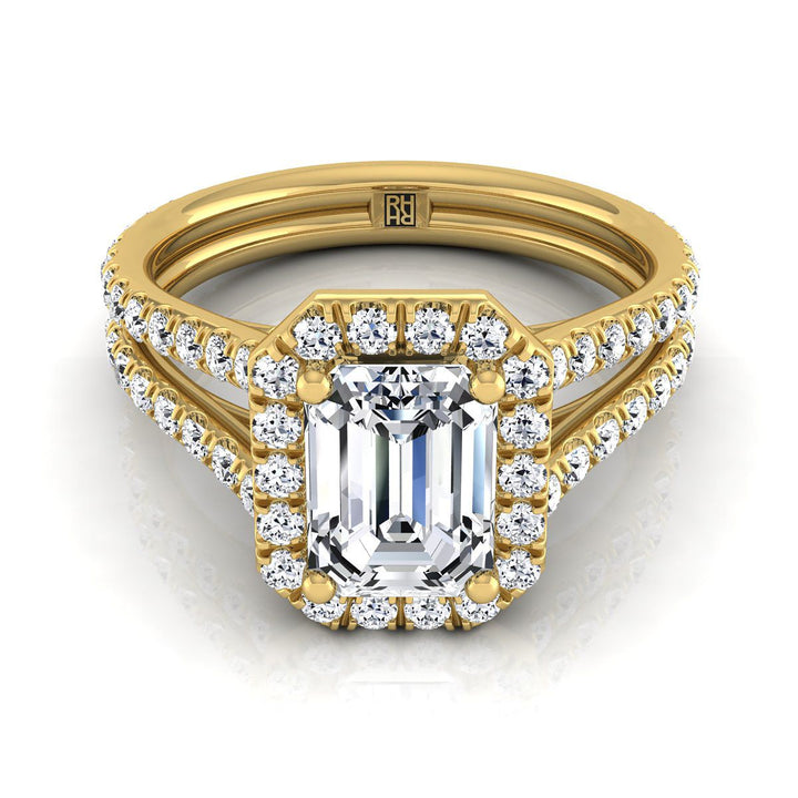 18K Yellow Gold Emerald Cut Diamond Halo Two Row Pavé Split Shank Engagement Ring -7/8ctw