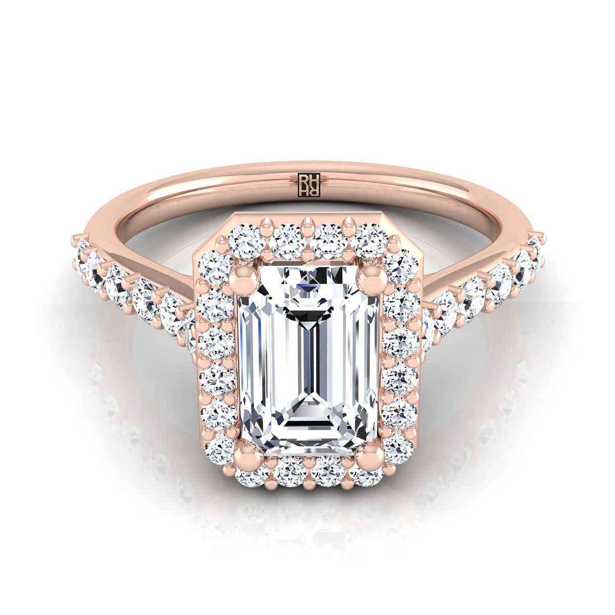 Classic And Elegant, This Emerald Cut Diamond Halo Engagement Ring With A Pave Shank Showcases Brilliant Cut Diamonds (h-i/vs 0.50ctw) Beautifully Set In A Classic 14k Rose Gold Setting.