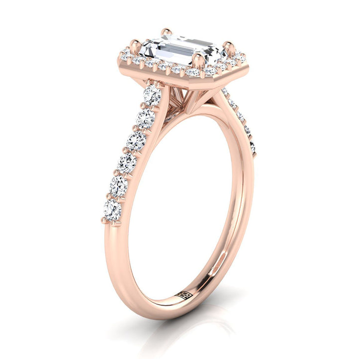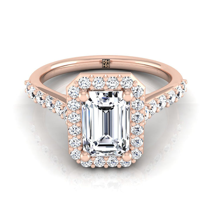 14K Rose Gold Emerald Cut Diamond Shared Prong Halo with French Pave Engagement Ring -1/2ctw