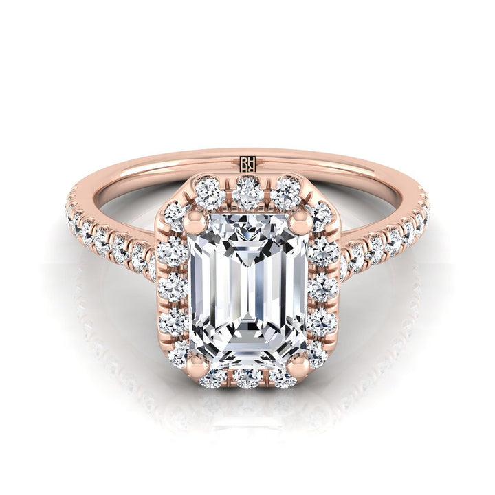 14K Rose Gold Emerald Cut Classic French Pave Halo and Linear Engagement Ring -3/8ctw