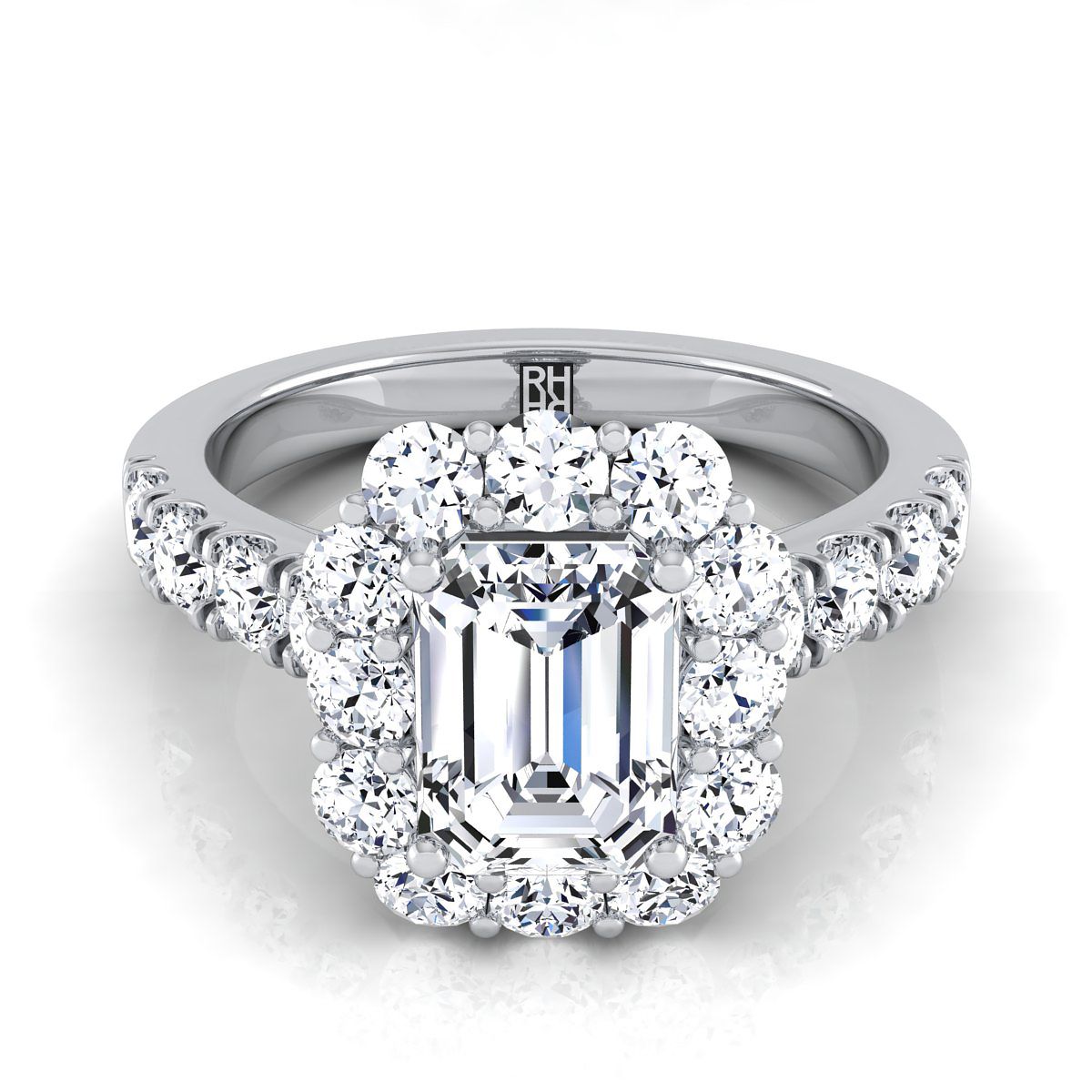 14K White Gold Emerald Cut Diamond Luxe Style French Pave Halo Engagement Ring -1-1/10ctw