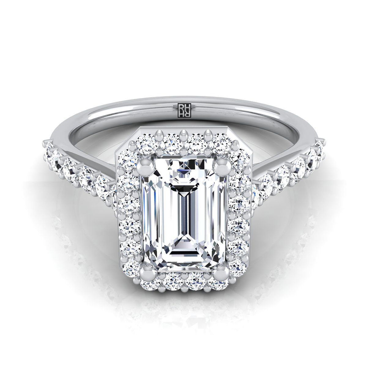 Classic And Elegant, This Emerald Cut Diamond Halo Engagement Ring With A Pave Shank Showcases Brilliant Cut Diamonds (h-i/vs 0.50ctw) Beautifully Set In A Classic Platinum Setting.