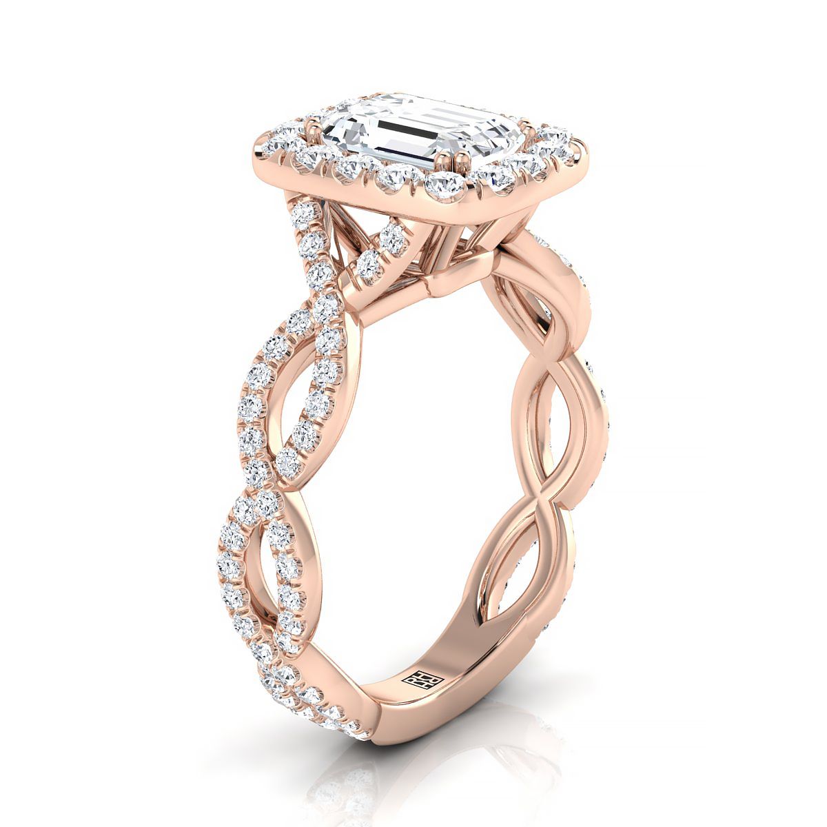 14K Rose Gold Emerald Cut Diamond Ribbon Twist French Pave Halo Engagement Ring -3/4ctw
