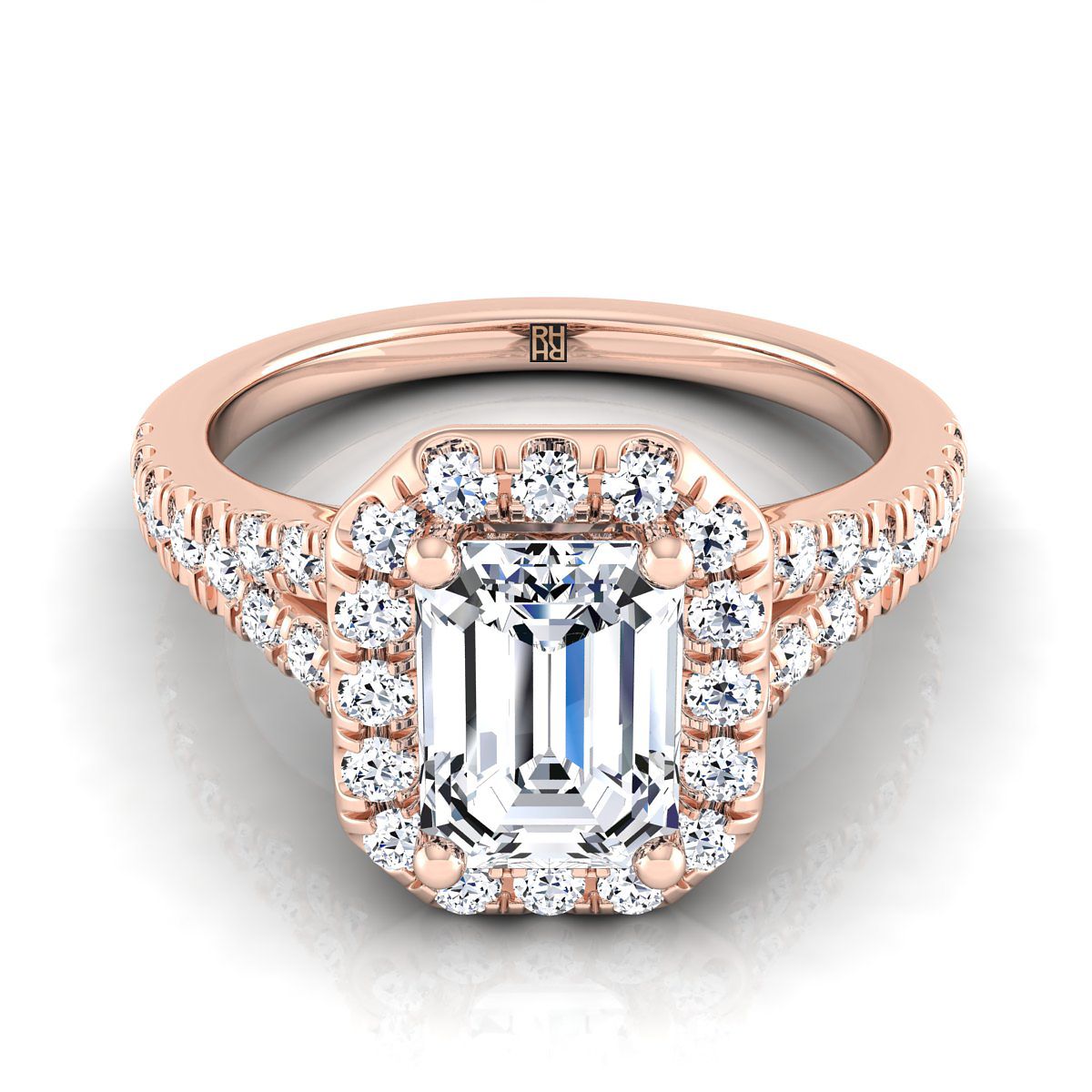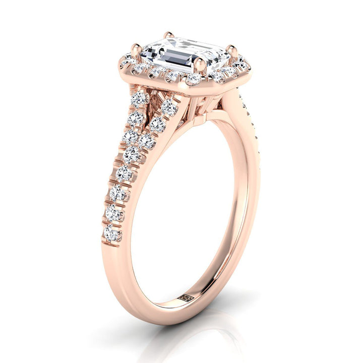 14K Rose Gold Emerald Cut Diamond Simple Prong Halo with Petite Split Shank Pave Engagement Ring -1/2ctw