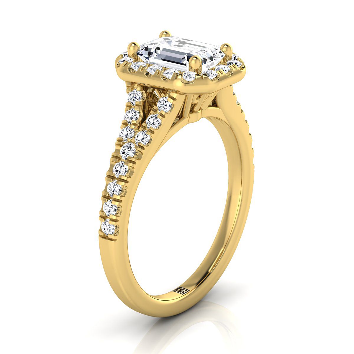 14K Yellow Gold Emerald Cut Diamond Simple Prong Halo with Petite Split Shank Pave Engagement Ring -1/2ctw