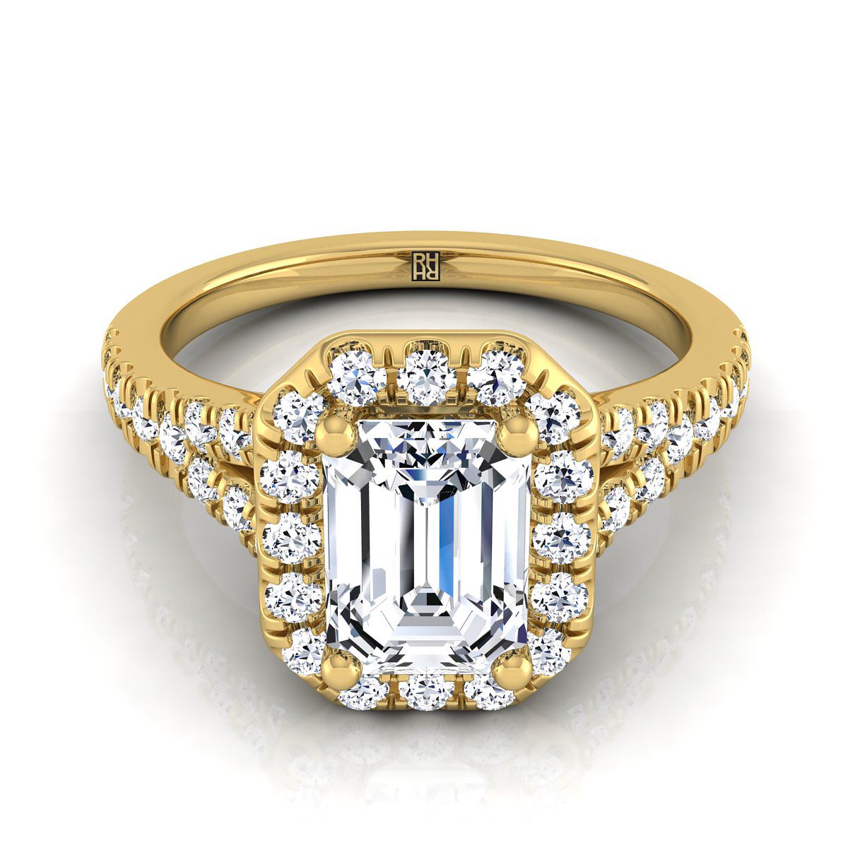 18K Yellow Gold Emerald Cut Diamond Simple Prong Halo with Petite Split Shank Pave Engagement Ring -1/2ctw
