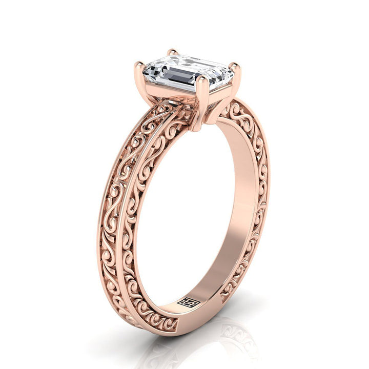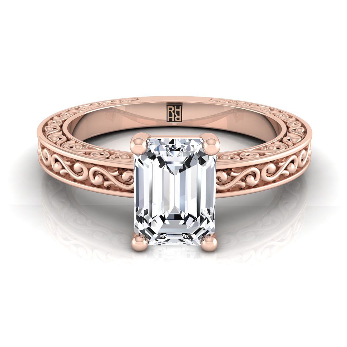 Understated Elegance, This Emerald Cut Diamond Engagement Ring Showcases A Scroll Engraved Design Shank With A Classic High Polish Finish In 14k Rose Gold