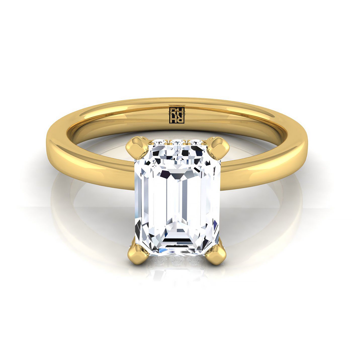 18K Yellow Gold Emerald Cut Diamond Adorned Claws and Secret Halo Solitaire Engagement Ring -1/10ctw