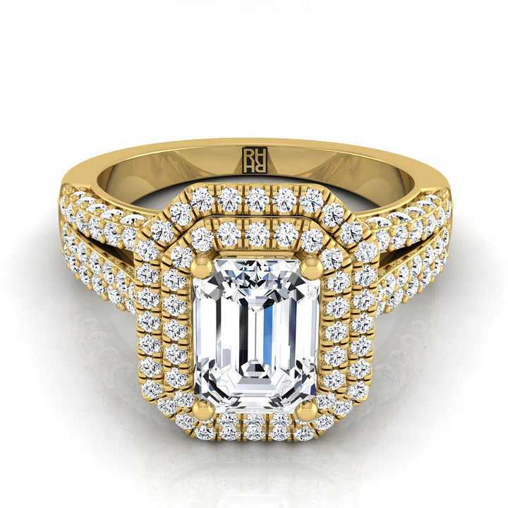 18K Yellow Gold Emerald Cut Extraordinary Three Tier Diamond Halo Crown Engagement Ring -7/8ctw