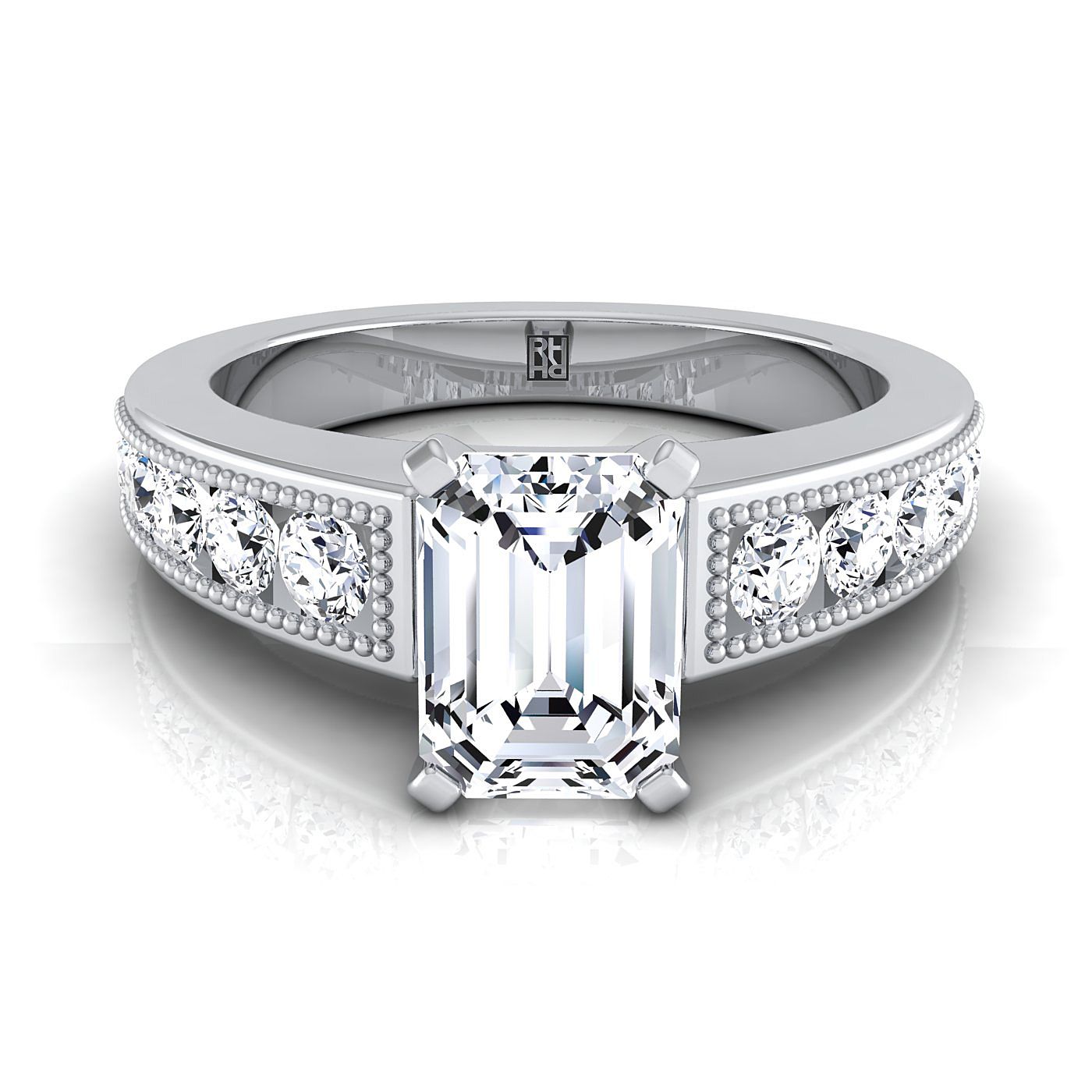 14K White Gold Emerald Cut Diamond Antique Milgrain Bead and Channel Set Engagement Ring -1/2ctw
