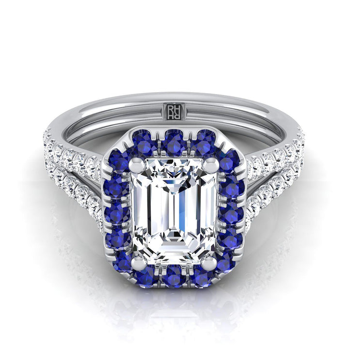 An Elegant Statement Of Style, This Emerald Cut Diamond With Sapphire Accented Halo Engagement Ring Showcases Brilliant Cut Diamonds (h-i/vs 0.40ctw) With An Exquisite Pave Split Shank Mounted In A Platinum Setting.