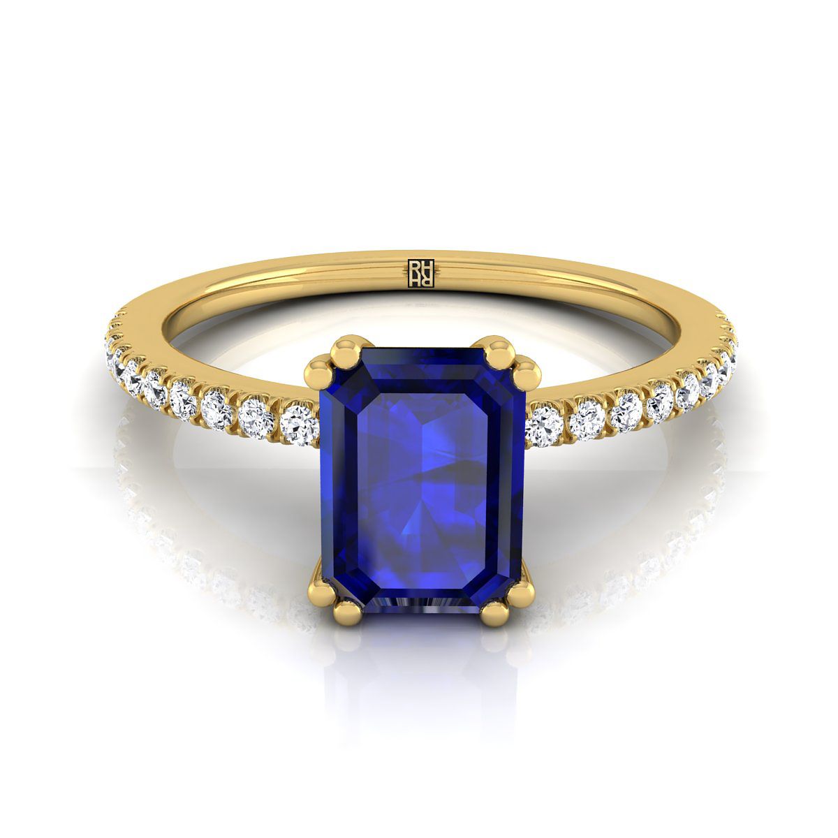 18K Yellow Gold Emerald Cut Sapphire Simple French Pave Double Claw Prong Diamond Engagement Ring -1/6ctw