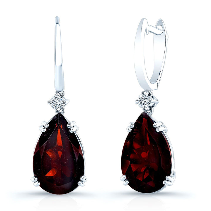 14k White Gold Earrings With 2 Pear-shaped Garnet Stones At 14x9mm (ctw) And 2 Round Brilliant Diamonds Weighing 0.10ctw