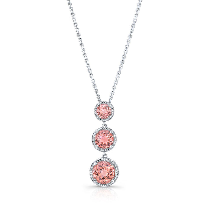 14k White Gold Pendant With 3 Round Pink Tourmaline At 4mm, 5mm, 6mm Includes 17 Inch Baby Curb Chain