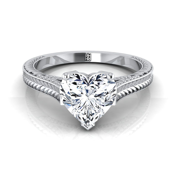 14K White Gold Heart Shape Center Hand Engraved Vintage Cathedral Style Solitaire Engagement Ring