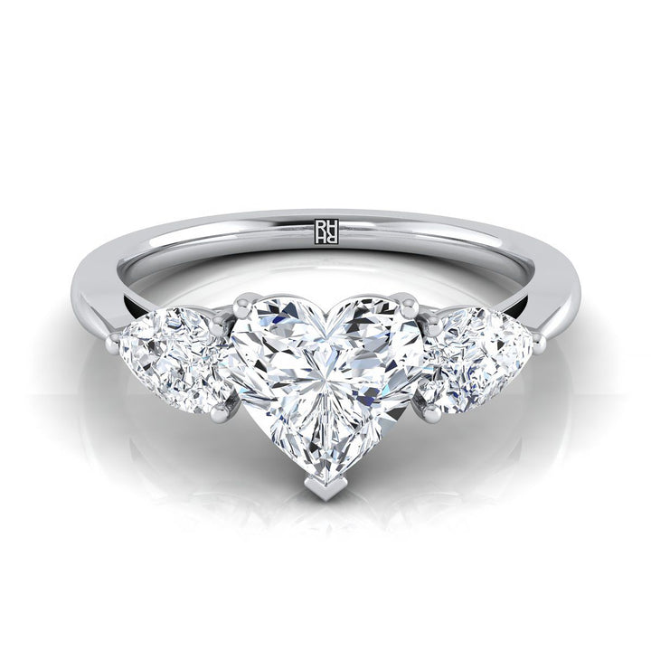 18K White Gold Heart Shape Center Diamond Perfectly Matched Pear Shaped Three Diamond Engagement Ring -7/8ctw