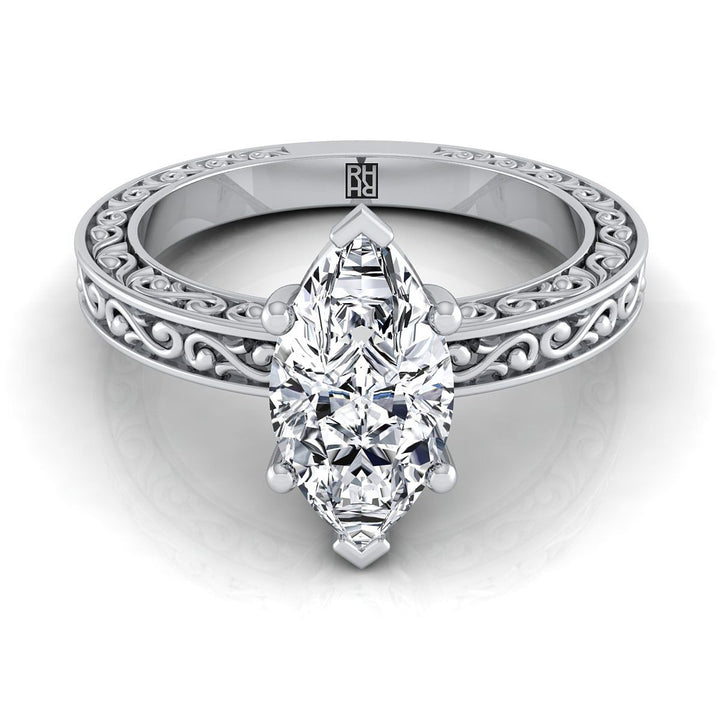 18K White Gold Marquise Hand Engraved Scroll Vintage Solitaire Engagement Ring