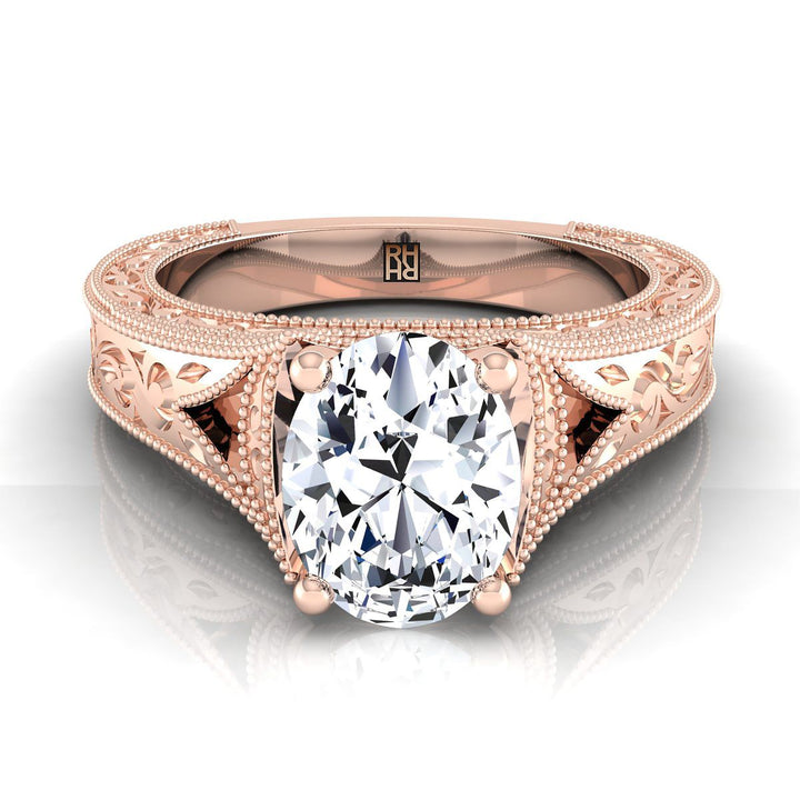 14K Rose Gold Oval Hand Engraved and Milgrain Vintage Solitaire Engagement Ring