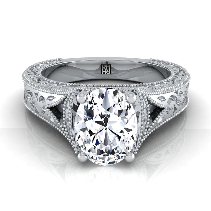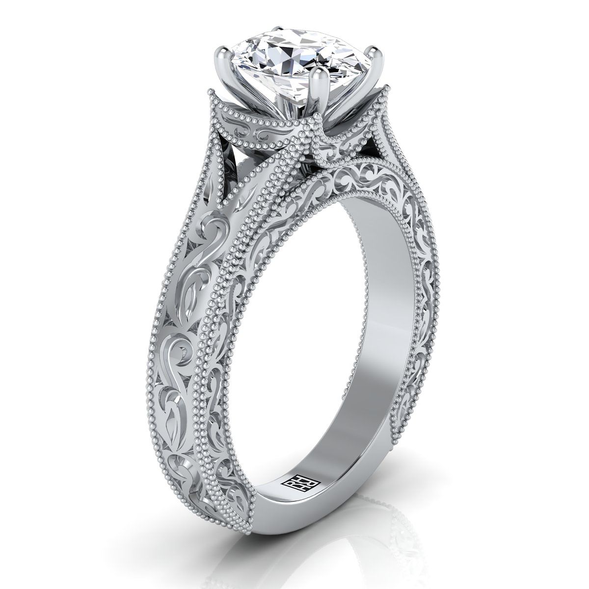 Platinum Oval Hand Engraved and Milgrain Vintage Solitaire Engagement Ring