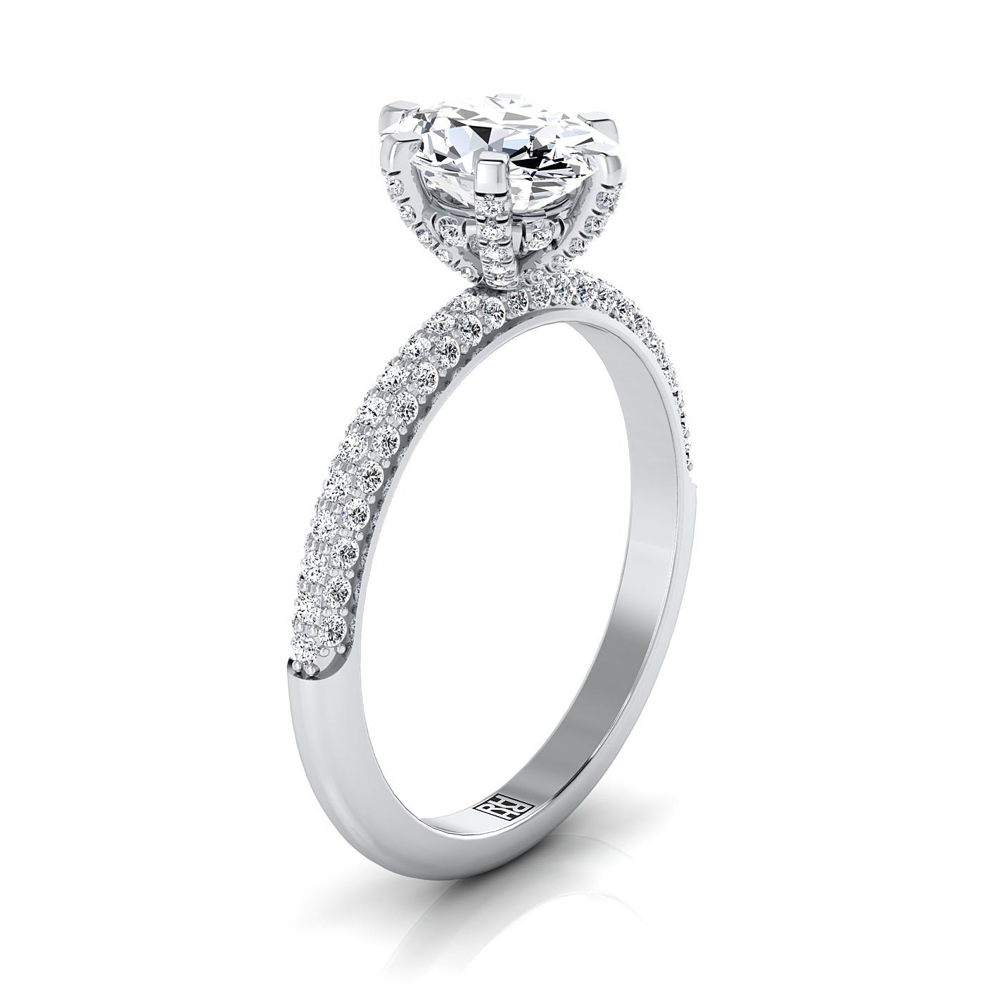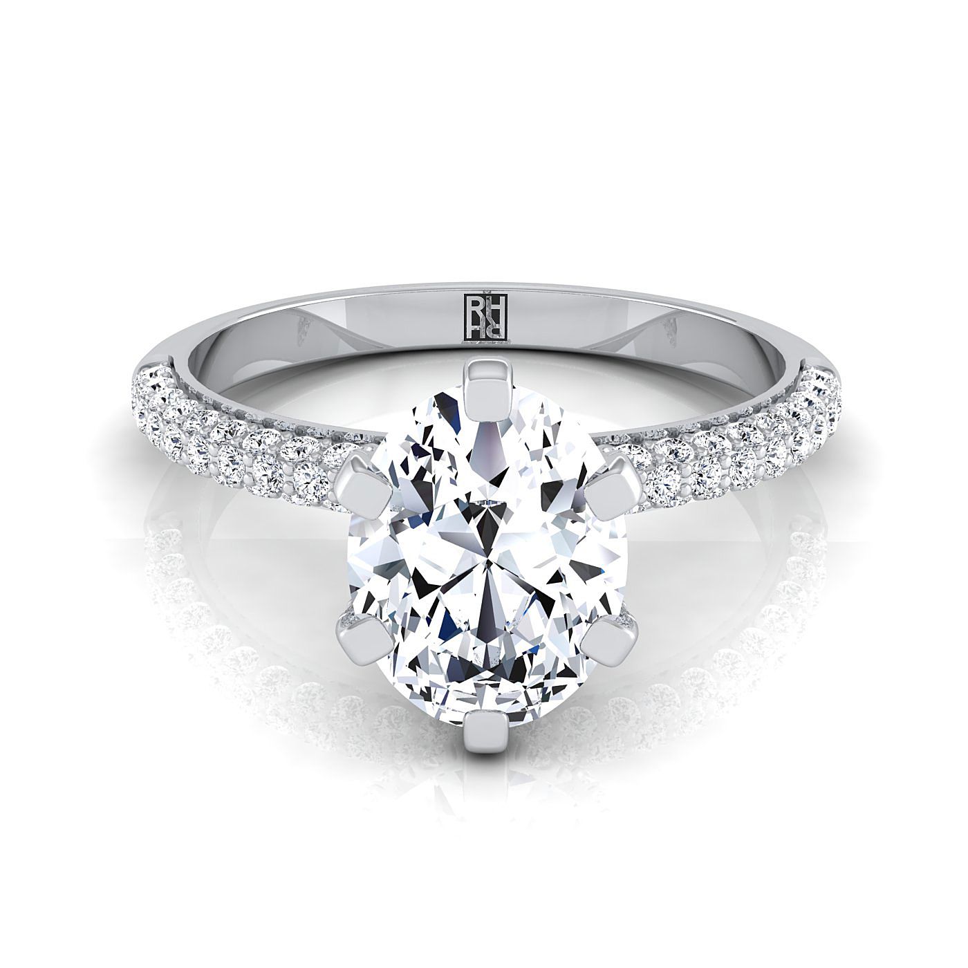 18K White Gold Oval Diamond Three Row French Pave Simple Engagement Ring -1/3ctw