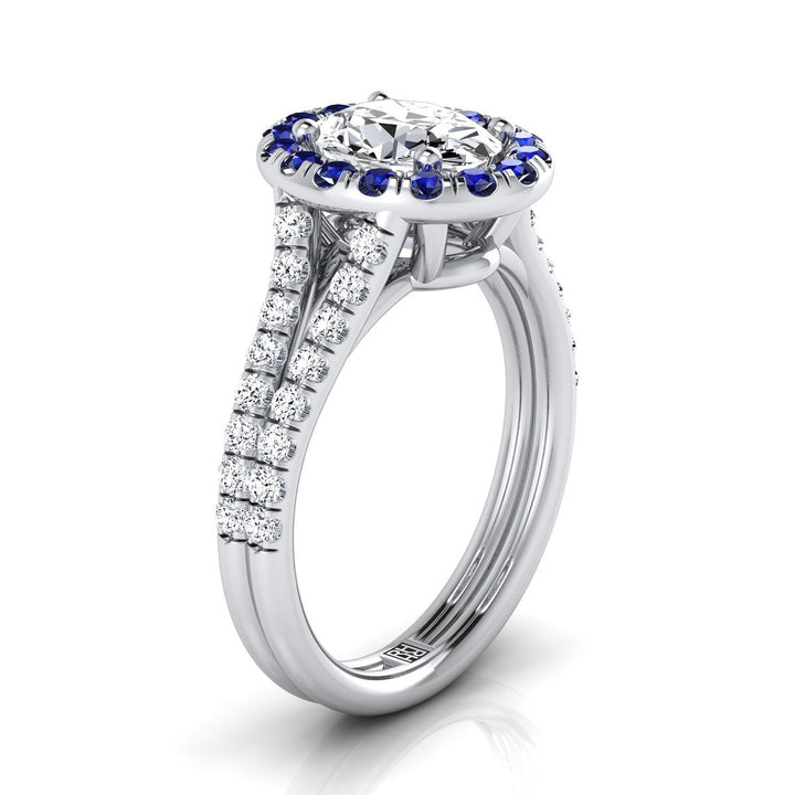 An Elegant Statement Of Style, This Oval Diamond With Sapphire Accented Halo Engagement Ring Showcases Brilliant Cut Diamonds (h-i/vs 0.40ctw) With An Exquisite Pave Split Shank Mounted In A 14k White Gold Setting.
