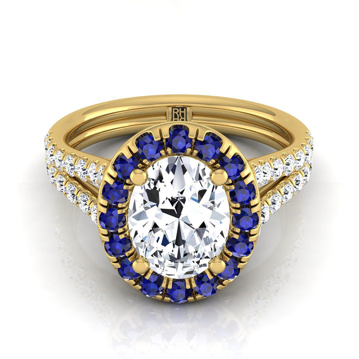 An Elegant Statement Of Style, This Oval Diamond With Sapphire Accented Halo Engagement Ring Showcases Brilliant Cut Diamonds (h-i/vs 0.40ctw) With An Exquisite Pave Split Shank Mounted In A 14k Yellow Gold Setting.