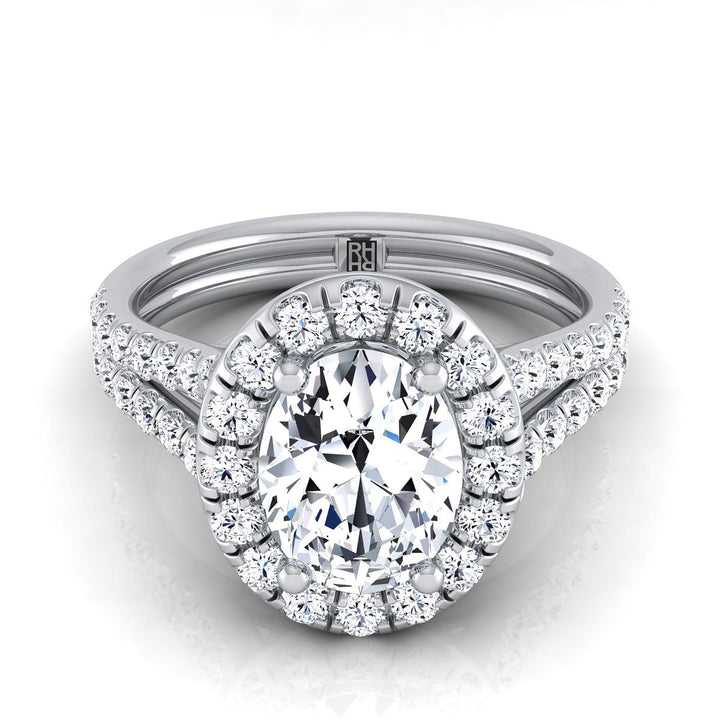 18K White Gold Oval Diamond French Pave Split Shank Halo Engagement Ring -5/8ctw
