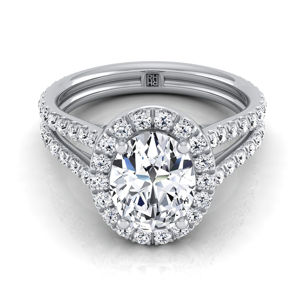 18K White Gold Oval Diamond Halo Two Row Pavé Split Shank Engagement Ring -7/8ctw