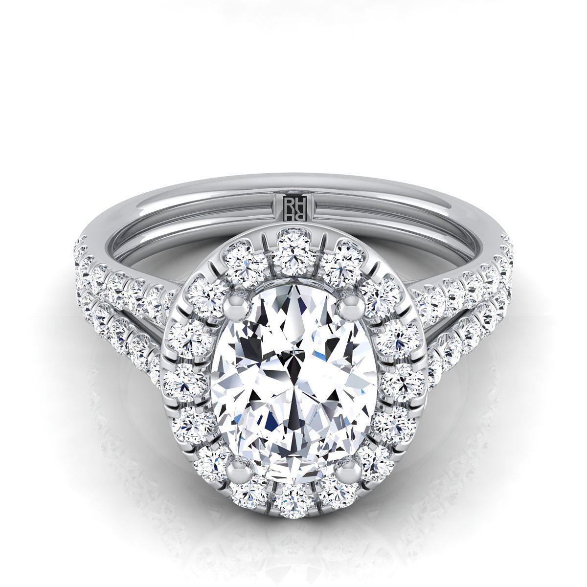Platinum Oval Diamond French Pave Split Shank Halo Engagement Ring -5/8ctw