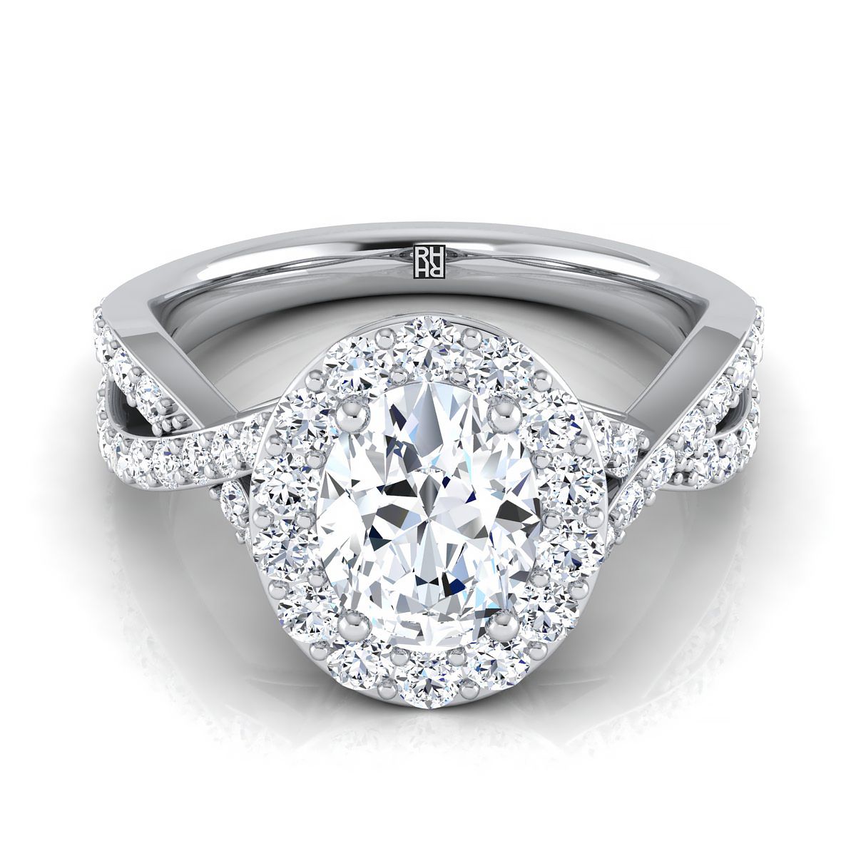 A Modern Statement Of Style, This Oval Halo Pave Engagement Ring With Infinity Shank Showcases Brilliant Cut Diamonds (h-i/vs 0.75ctw) Mounted In A 14k White Gold Setting.