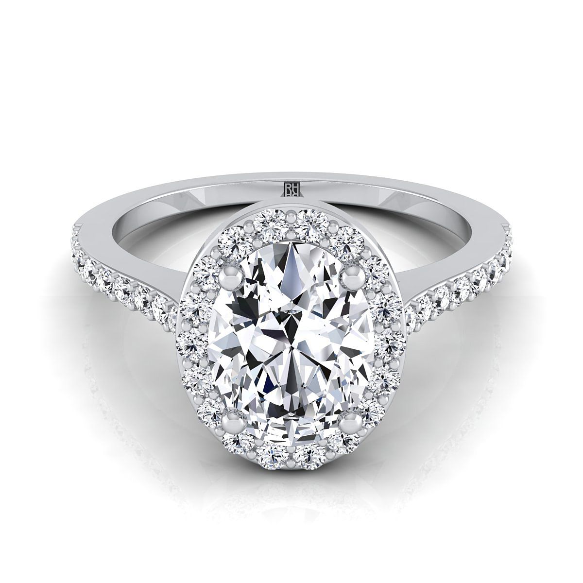 18K White Gold Oval Classic French Pave Diamond Halo and Linear Engagement Ring -1/3ctw