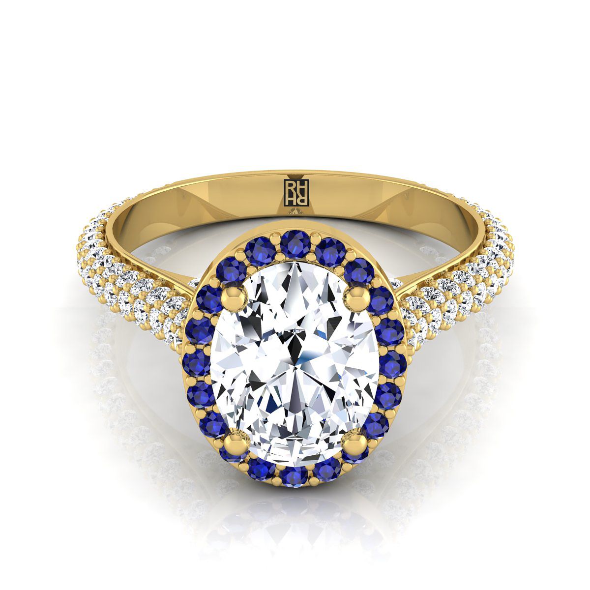 Exquisitely Handcrafted, This Oval Diamond Engagement Ring With Sapphire Accented Halo Showcases Brilliant Cut Diamonds (h-i/vs 0.75ctw) Beautifully Pave Set In A Classic 14k Yellow Gold Setting