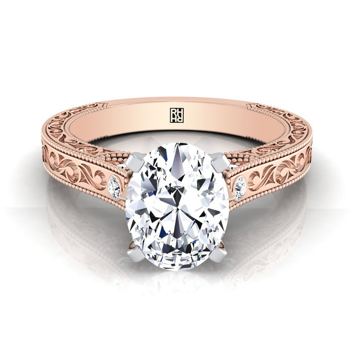 Understated Elegance, This Oval Diamond Engagement Ring Showcases A Scroll Engraved Design Shank With A Classic High Polish Finish In 14k Rose Gold