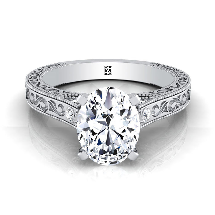 Understated Elegance, This Oval Diamond Engagement Ring Showcases A Scroll Engraved Design Shank With A Classic High Polish Finish In 18k White Gold