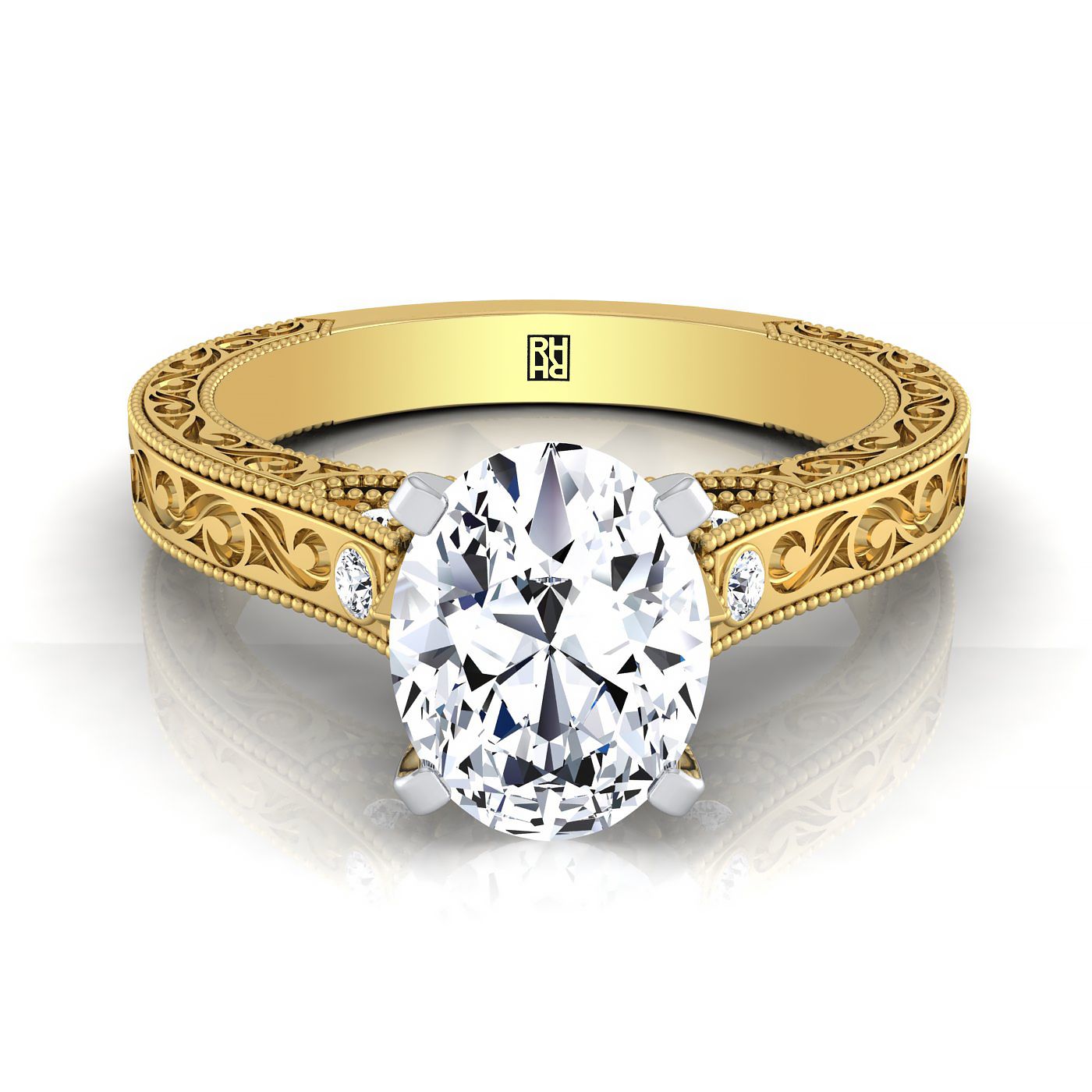 Understated Elegance, This Oval Diamond Engagement Ring Showcases A Scroll Engraved Design Shank With A Classic High Polish Finish In 18k Yellow Gold