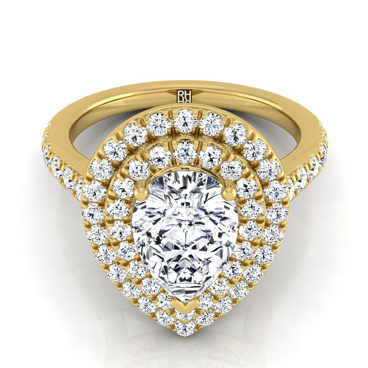 14K Yellow Gold Pear Shape Center Double Pave Halo with Linear Diamond Engagement Ring -7/8ctw