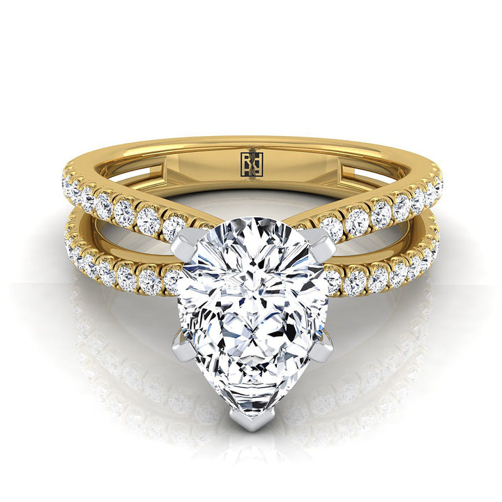18K Yellow Gold Pear Shape Center Diamond Two Row Pavé Split Shank Engagement Ring -1/3ctw