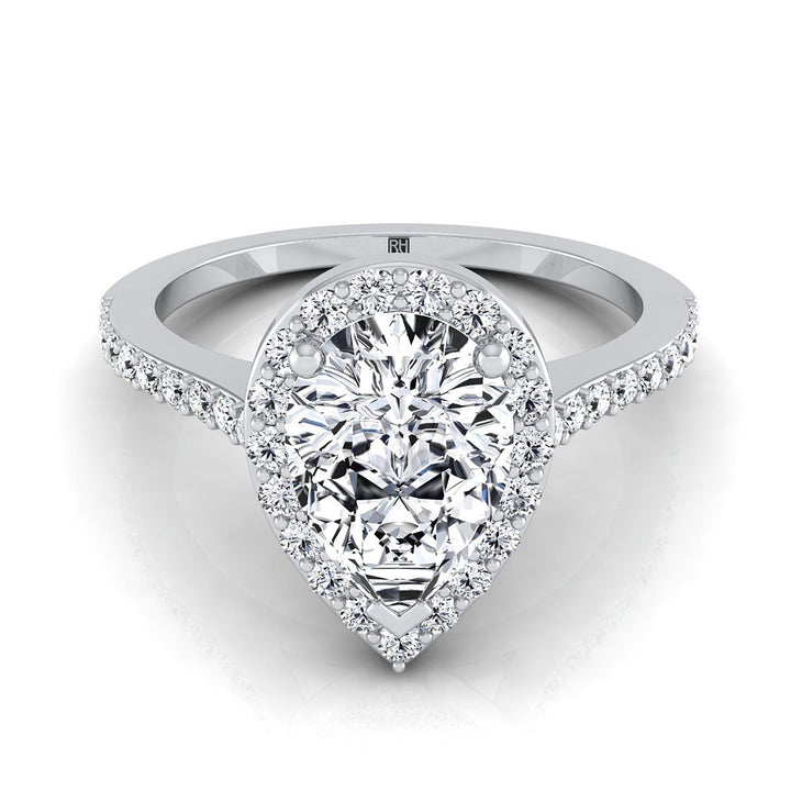 18K White Gold Pear Shape Center Classic French Pave Diamond Halo and Linear Engagement Ring -1/3ctw