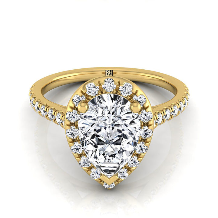 18K Yellow Gold Pear Shape Center Classic French Pave Halo and Linear Engagement Ring -3/8ctw