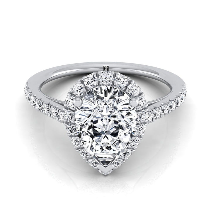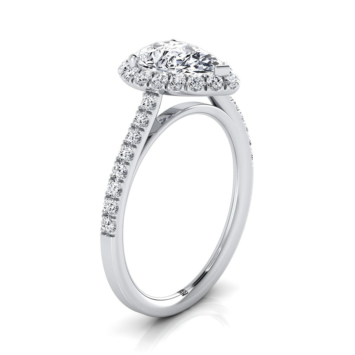 14K White Gold Pear Shape Center Diamond Petite Halo French Pave Engagement Ring -3/8ctw