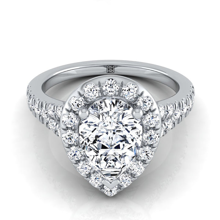 14K White Gold Pear Shape Center Diamond Simple Prong Halo with Petite Split Shank Pave Engagement Ring -1/2ctw