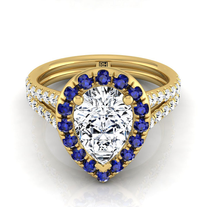 An Elegant Statement Of Style, This Pear Shape Diamond With Sapphire Accented Halo Engagement Ring Showcases Brilliant Cut Diamonds (h-i/vs 0.40ctw) With An Exquisite Pave Split Shank Mounted In A 14k Yellow Gold Setting.