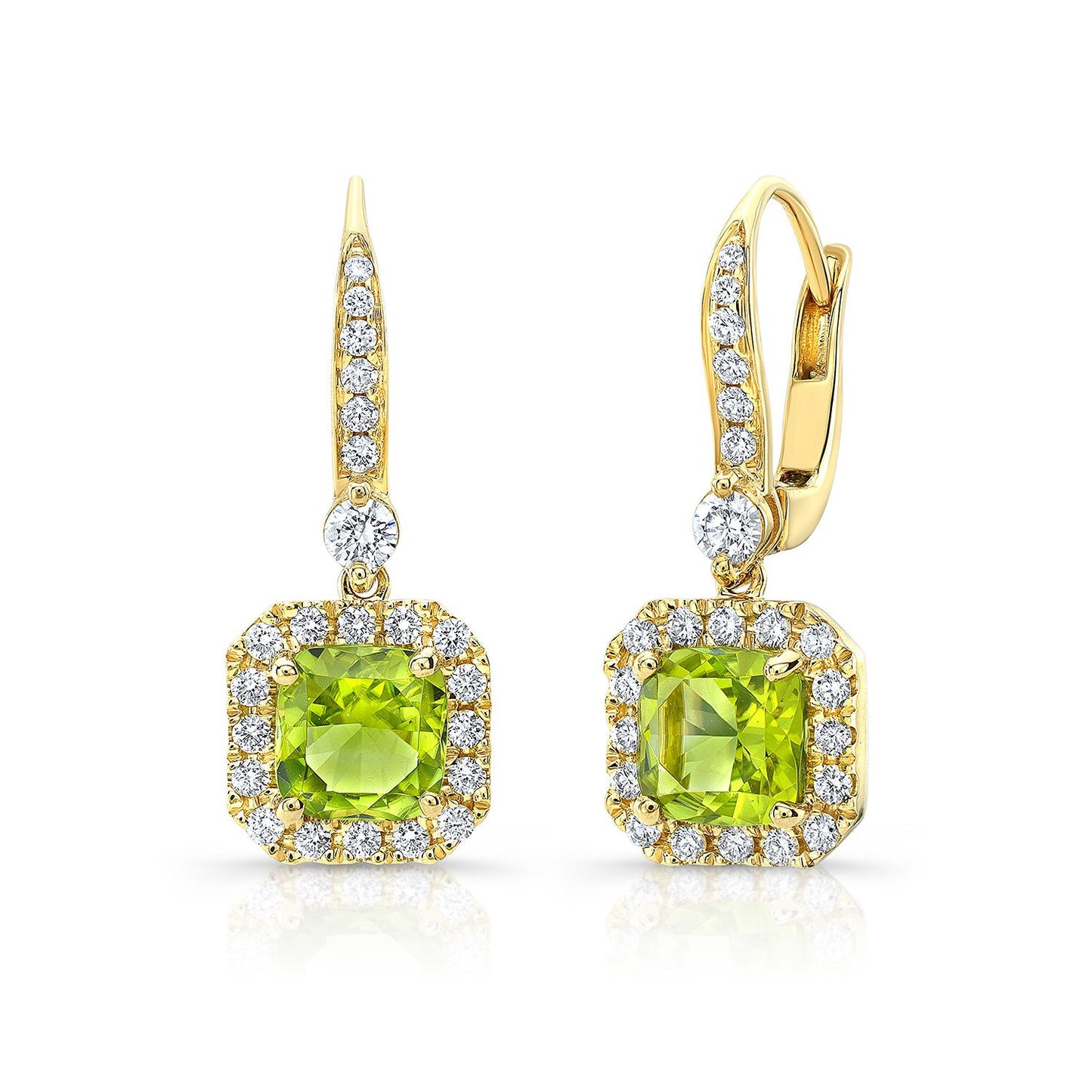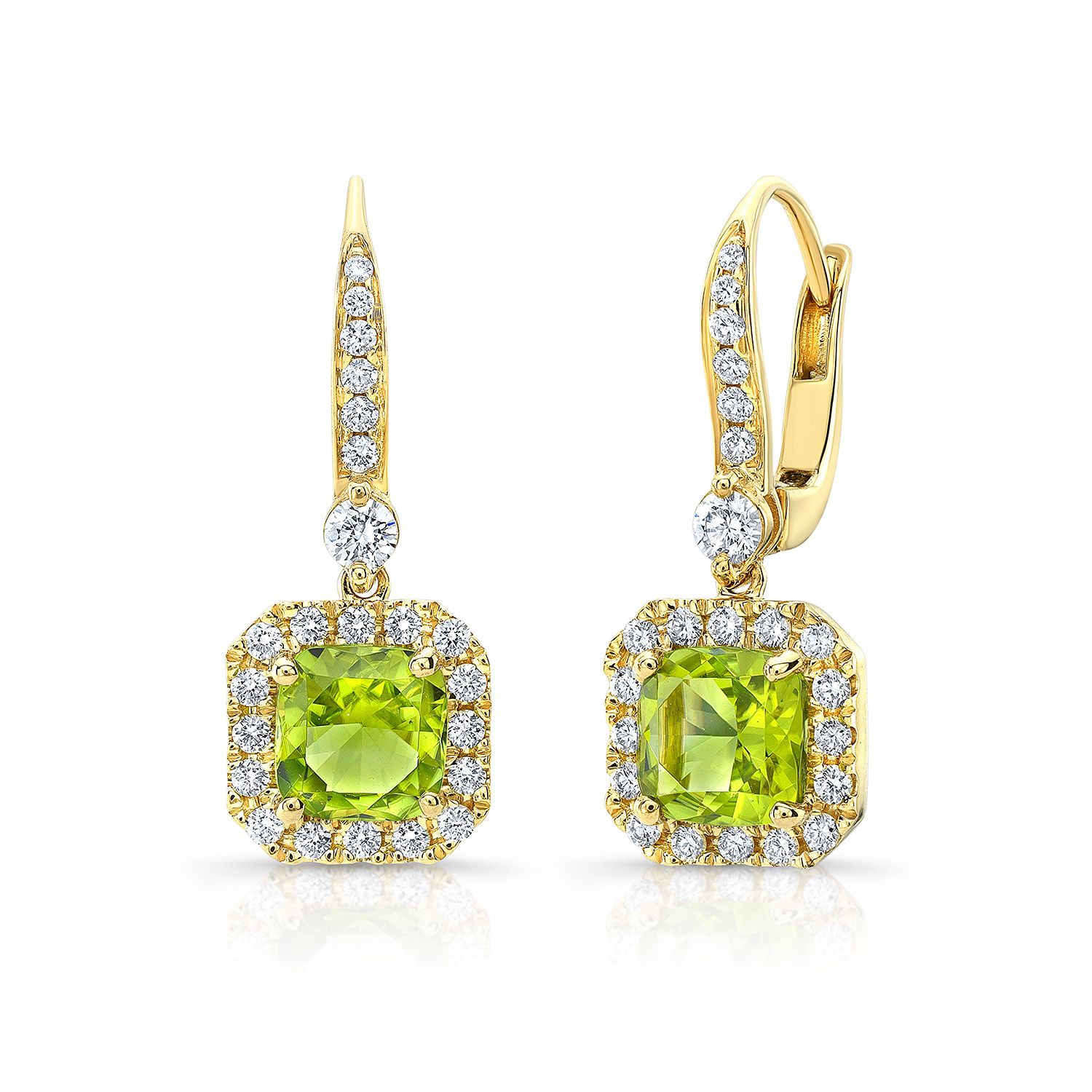 Peridot And Diamond Cushion Dangle Earrings With Pave Tops In 14k Yellow Gold (6mm)