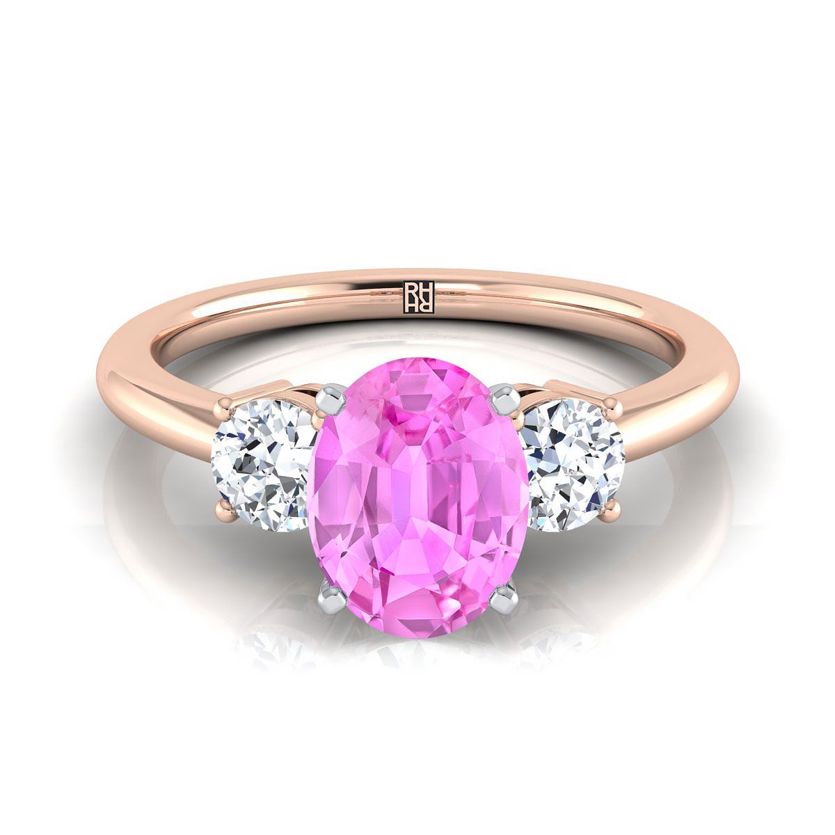 14K Rose Gold Oval Pink Sapphire Perfectly Matched Round Three Stone Diamond Engagement Ring -1/4ctw
